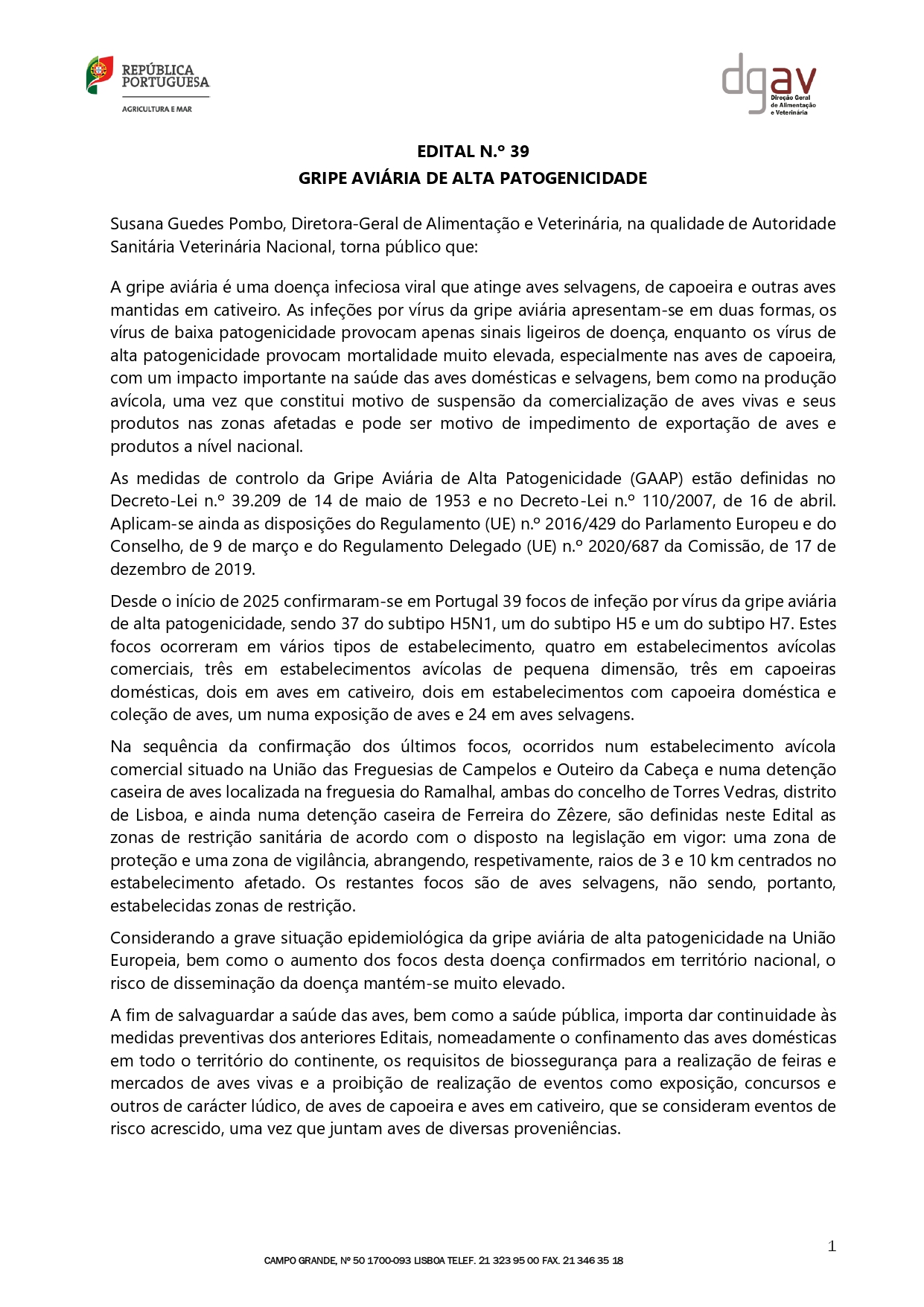 Deteção de focos de infeção por vírus da gripe aviária do subtipo H5N1 – Foco 2025/40
