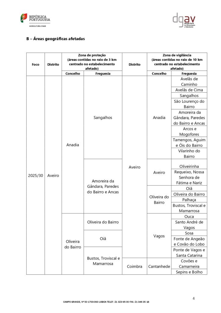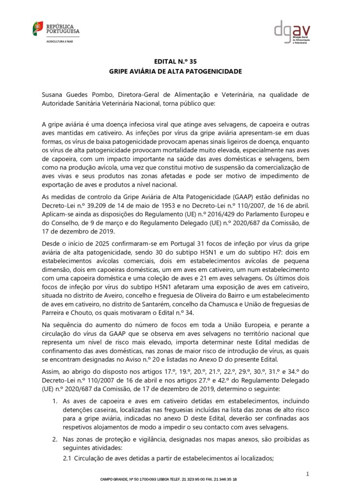 EDITAL Nº36 – Deteção de foco de infeção por vírus da gripe aviária de alta patogenicidade – Aves em cativeiro – Irivo, Penafiel – Foco 2025/32/GAAP