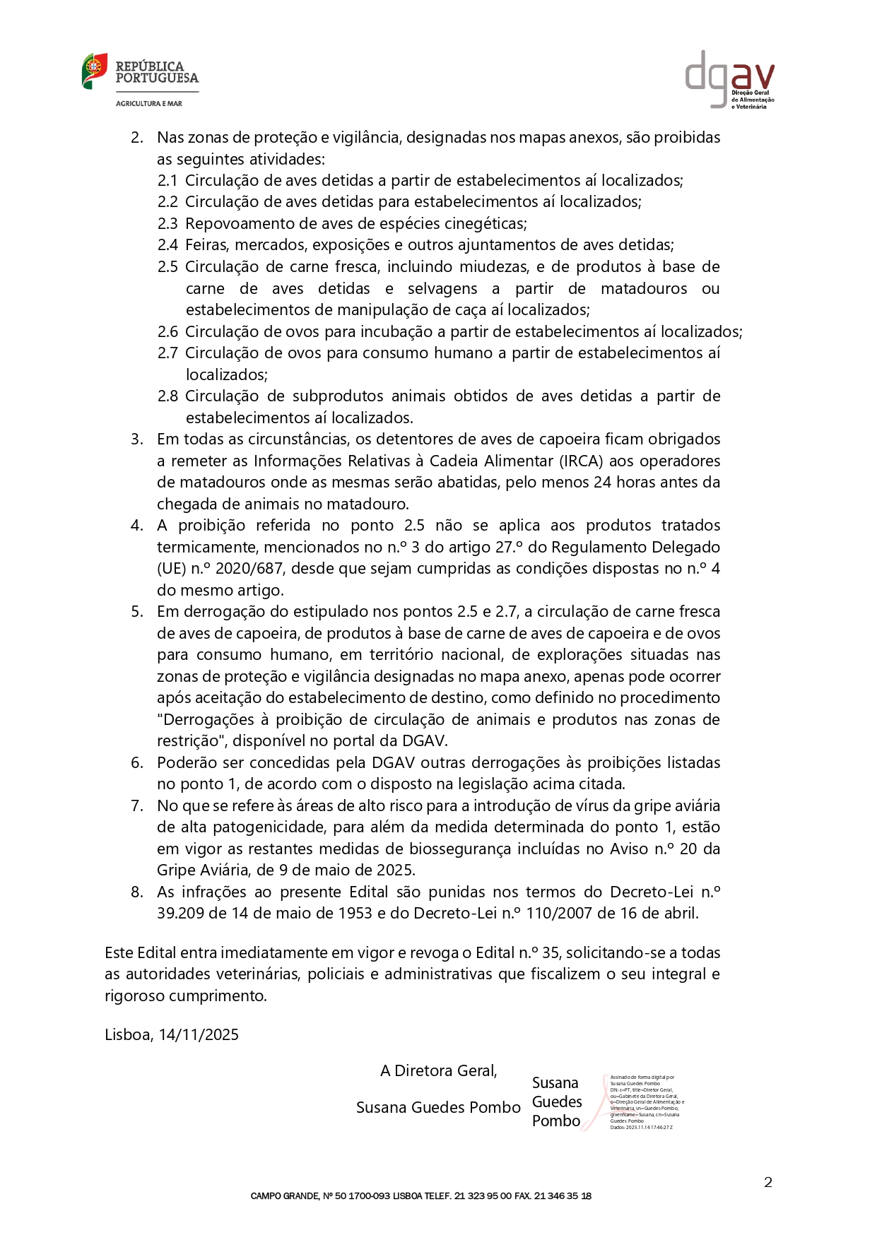 EDITAL Nº36 – Deteção de foco de infeção por vírus da gripe aviária de alta patogenicidade – Aves em cativeiro – Irivo, Penafiel – Foco 2025/32/GAAP