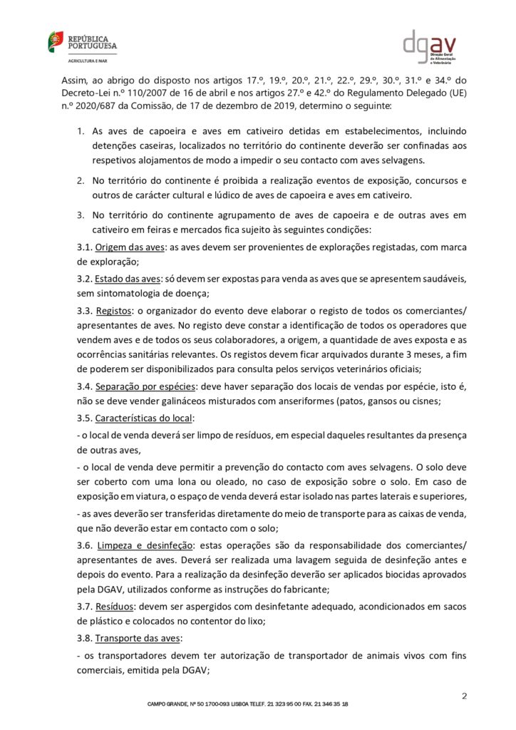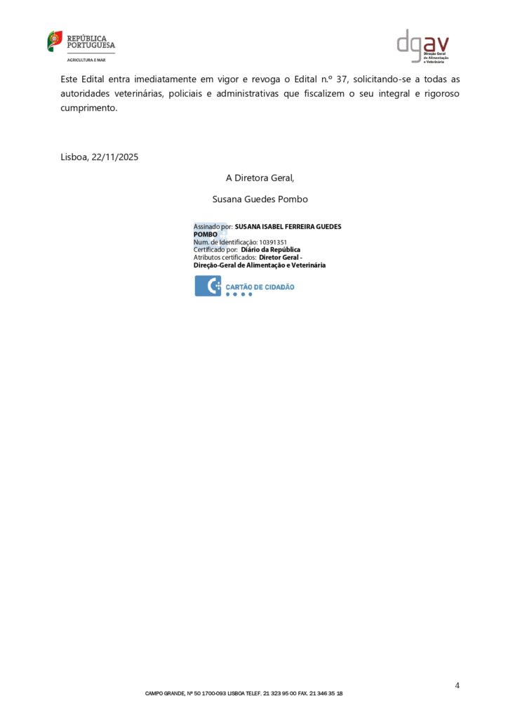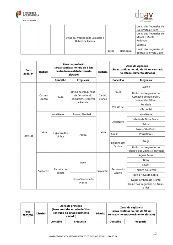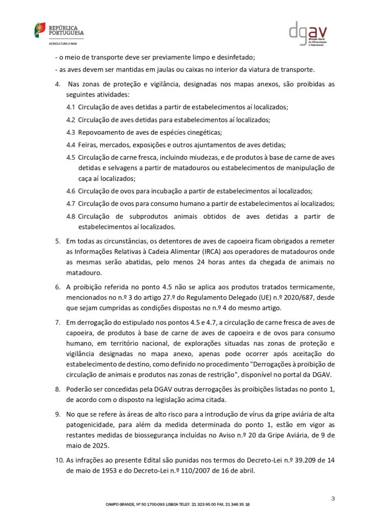Edital nº38 da DGAV- Confirmação de vários focos de infeção por vírus da gripe aviária de alta patogenicidade (GAAP) do subtipo H5N1 25/11/202525 Novembro, 2025