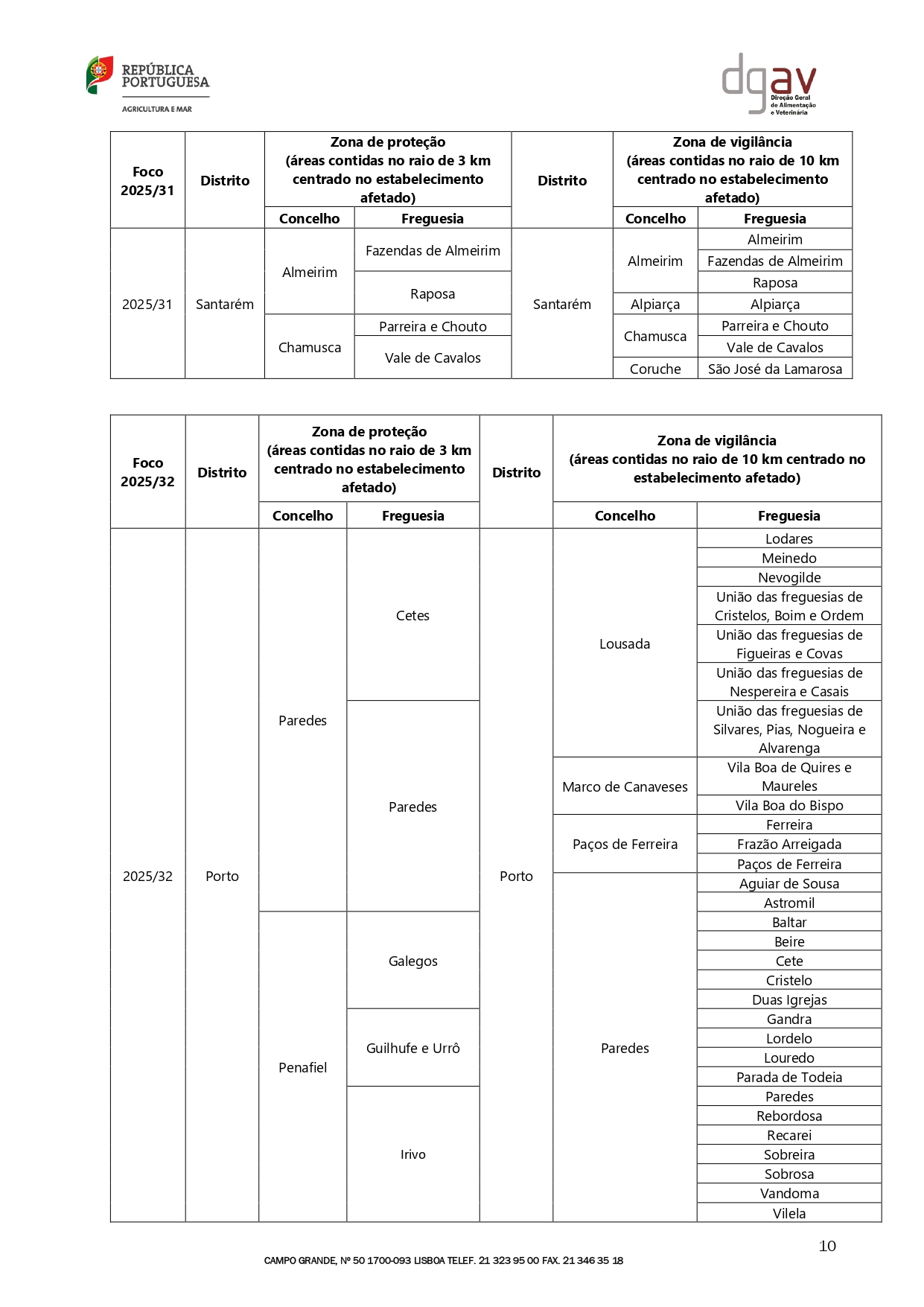 Edital nº38 da DGAV- Confirmação de vários focos de infeção por vírus da gripe aviária de alta patogenicidade (GAAP) do subtipo H5N1