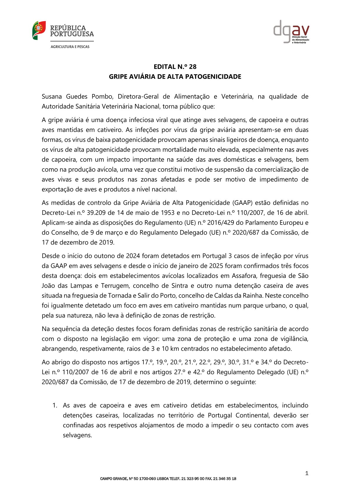 GRIPE AVIÁRIA DE ALTA PATOGENICIDADE EDITAL N.o 28