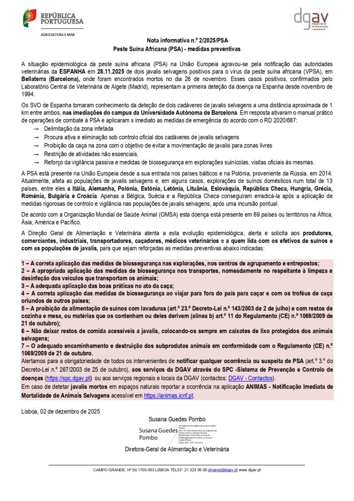 Peste Suína Africana em Espanha (Catalunha) – Nota informativa n.º 2/2025